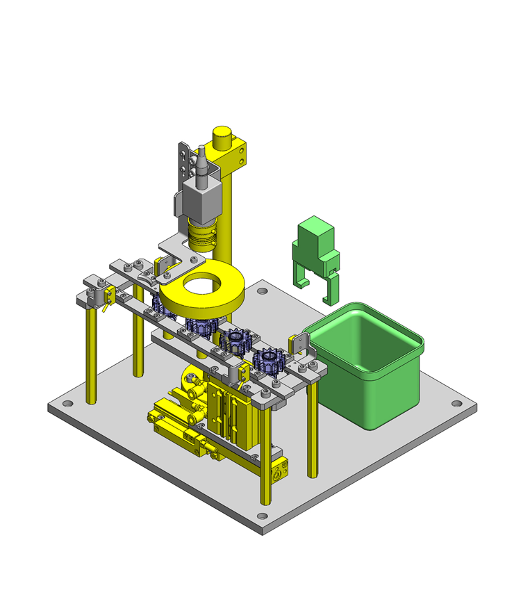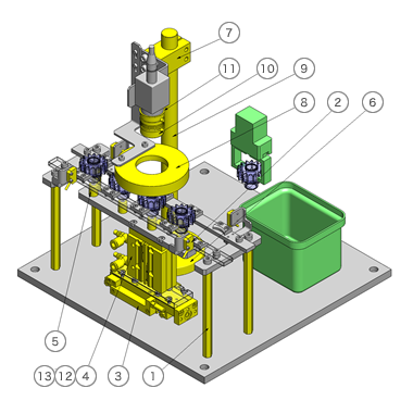 為了避免工件投放、取出用的夾具與工件導(dǎo)塊干涉,工件臺上的工件定位采用雙向定位。這樣,夾具爪可在工件中心附近進行抓取。