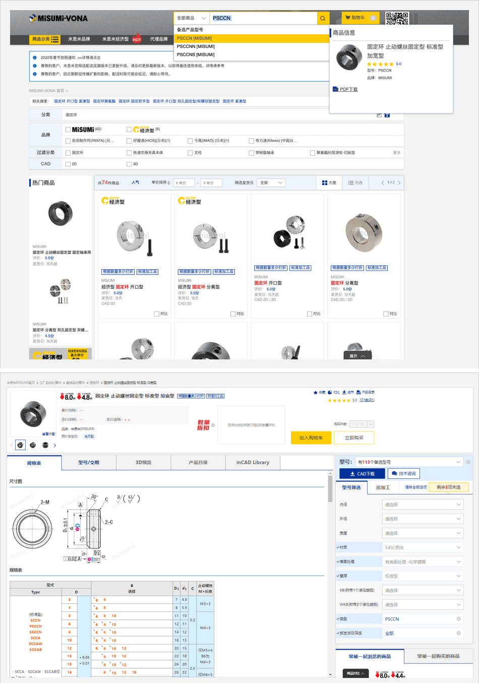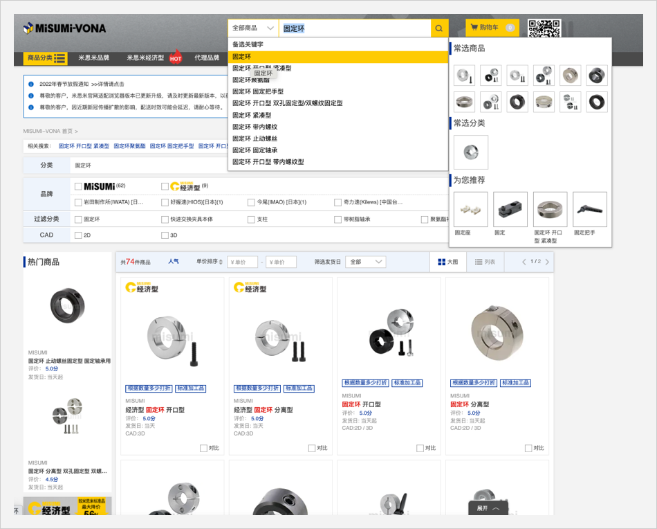 在搜索框中输入型号的一部分,下方将会显示相关备选型号;点击备选型号,将打开相对应的商品页。