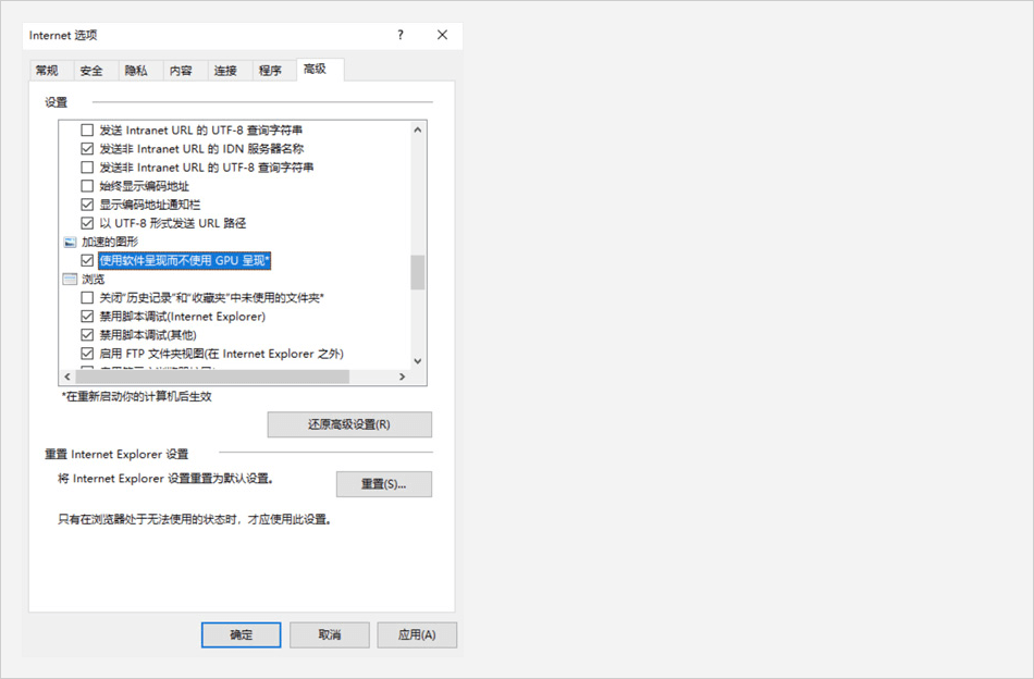 點擊控制面板中的【Internet 選項】,在【高級】標簽中,選中 【加速的圖形】下,使用軟件呈現(xiàn)而不使用GPU呈現(xiàn)。點【【應用】【確認】,重啟后生效。