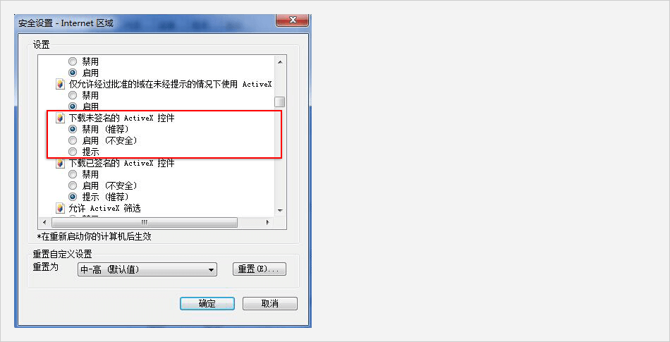 「顯示對話框」或「改為有效」。ActiveX安裝完以后請再返回到原本的設置。