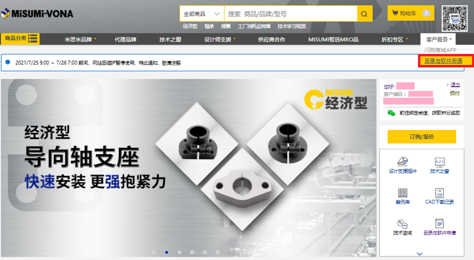 1.登錄米思米官網(wǎng)后選擇首頁(yè)【客戶服務(wù)】下拉框中的【目錄與軟件申請(qǐng)】。