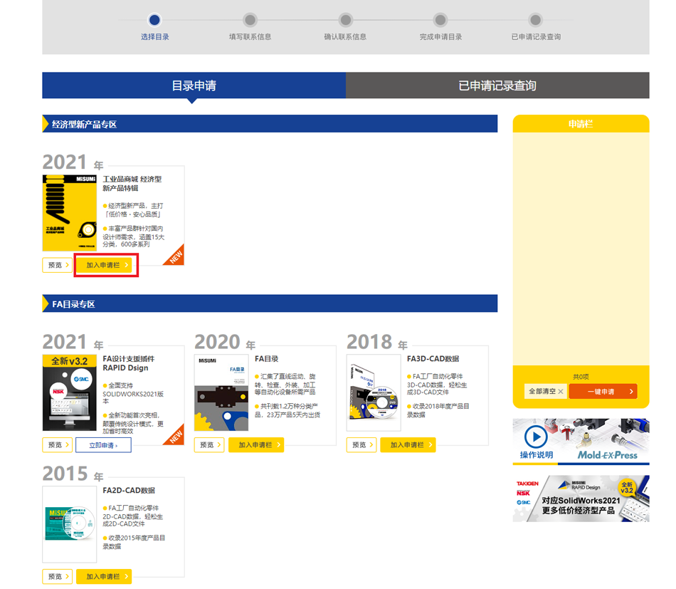 2.選擇需要的產(chǎn)品目錄,點(diǎn)擊【加入申請(qǐng)欄】。