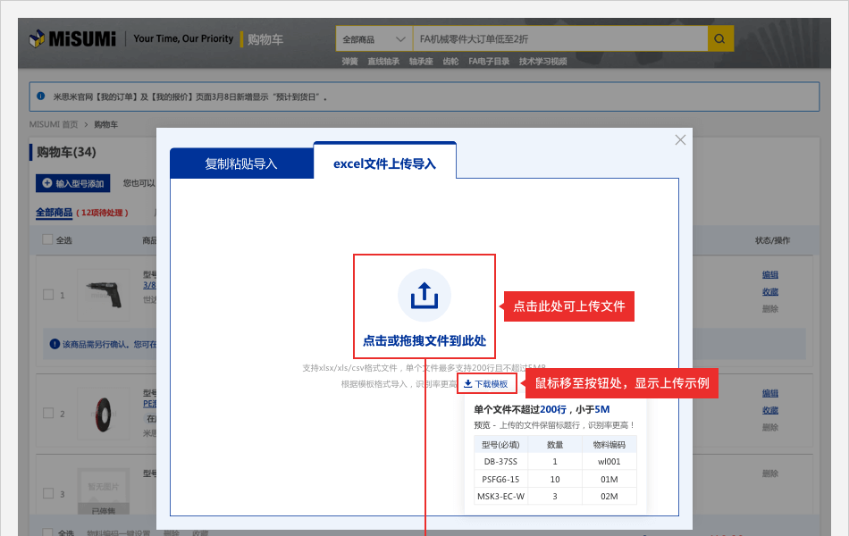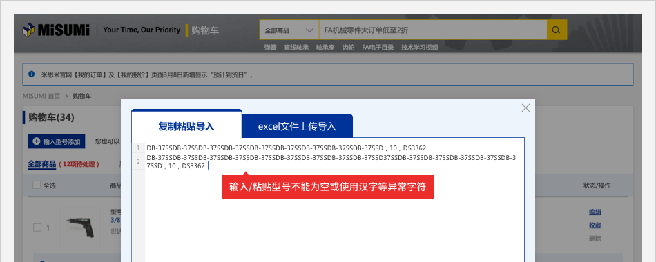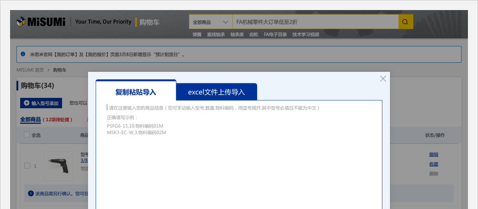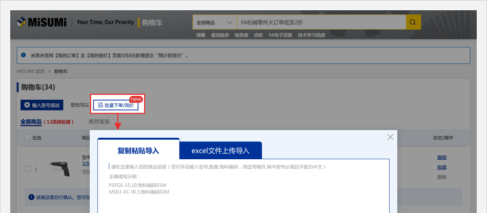 入口一:登錄米思米賬號,在【購物車】頁面,點擊【批量下單/詢價】按鈕,彈出【批量下單/詢價】彈窗。
