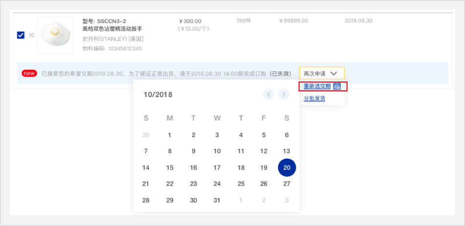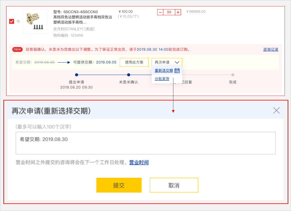 可根據(jù)米思米提供的新交期【使用此方案】或【再次申請】,如果選擇【再次申請】下拉內(nèi)容,選擇【重新選交期】可選擇指定交期時間,訂單確認(rèn)付款后米思米收到訂單,將會在工作日時間為您處理訂單;