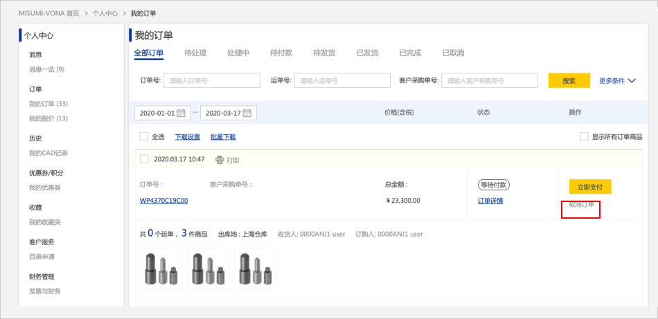 有1件商品等待米思米處理,我們將在2020.03.18.10.15前答復(fù),請耐心等待,可點擊【立即查看】頁面跳轉(zhuǎn)到商品詳情。