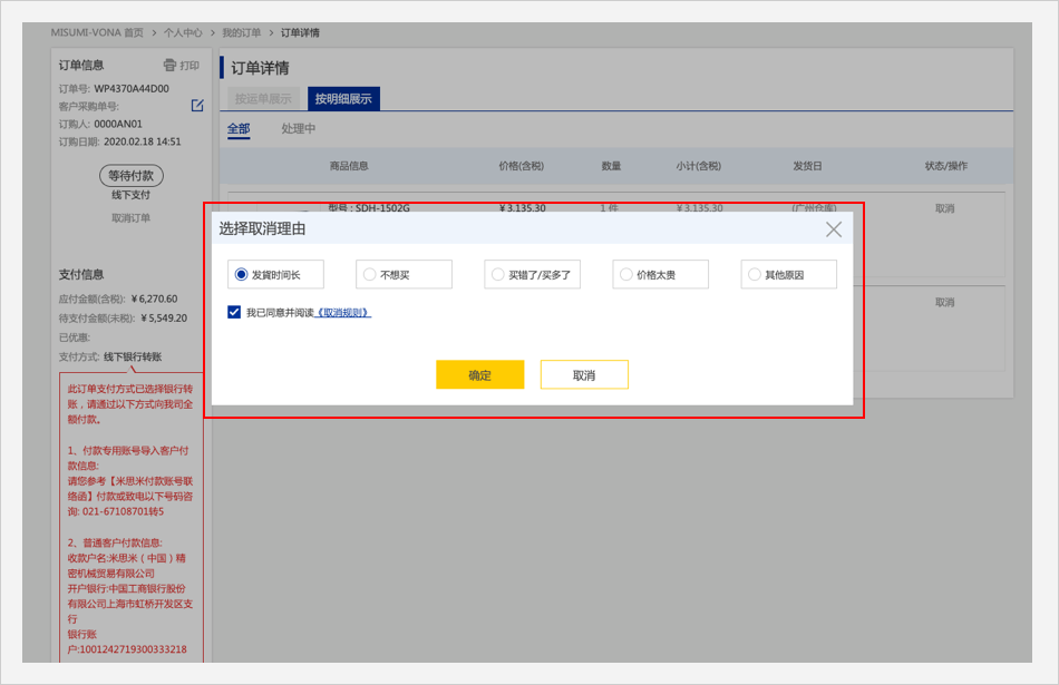 在訂單詳情頁面,【等待付款】的商品,點擊【取消】,頁面跳轉(zhuǎn)到彈窗。