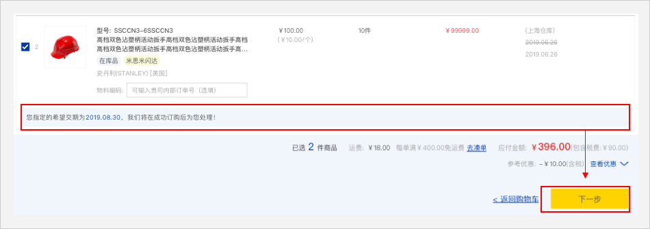 頁面跳轉(zhuǎn)到訂單確認(rèn)頁,新的交期已確定。米思米將在您訂購成功后為您處理。點擊【下一步】進(jìn)入訂購確認(rèn)頁面。