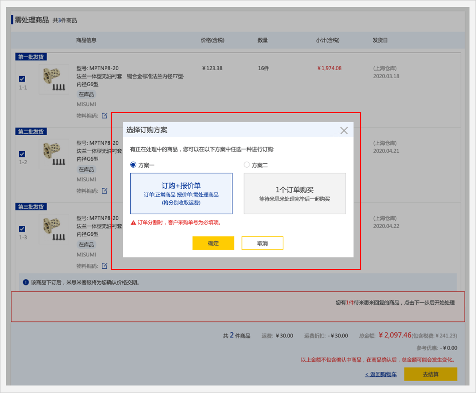 可根據(jù)米思米提供的新交期【使用此方案】或【再次申請】,如果選擇【使用此方案】unfit商品處理完成,頁面自動跳轉(zhuǎn)到訂單確認(rèn)頁面。