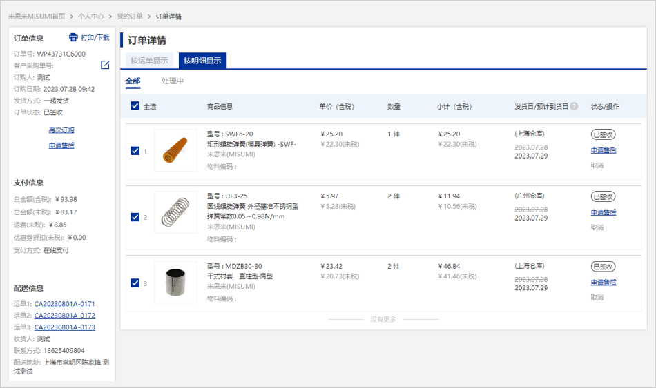 03訂單詳情中可以看到商品明細和發(fā)貨日期,已出貨商品可查看物流信息。