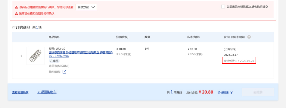 在【購(gòu)物車】頁(yè)面,即可直接查看對(duì)應(yīng)商品的預(yù)計(jì)到貨日。