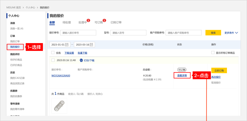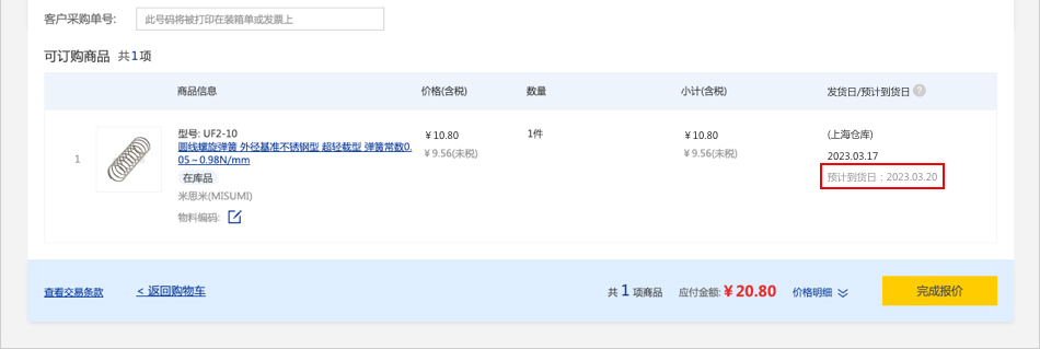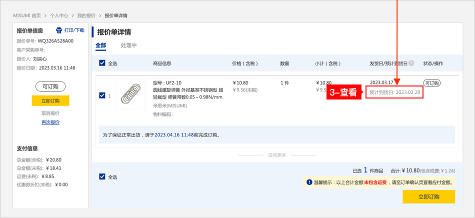 方法二:在【我的報(bào)價(jià)】頁(yè)面,點(diǎn)擊【查看詳情】,在訂單詳情頁(yè)面查看預(yù)計(jì)到貨日。