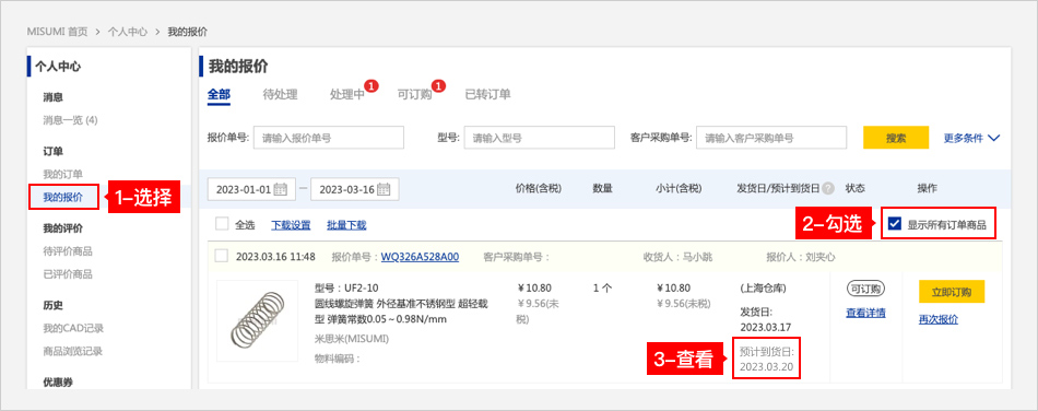 方法一:在【我的報(bào)價(jià)】頁(yè)面,勾選【顯示所有訂單商品】即可查看預(yù)計(jì)到貨日。