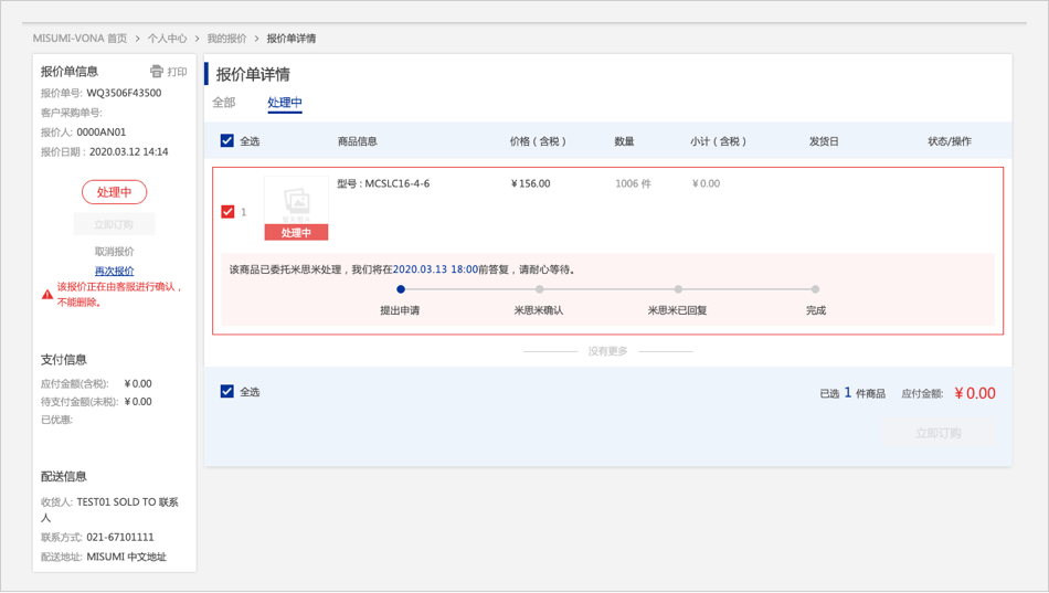 在报价详情页面,【处理中】的商品,点击【如何取消報(bào)價(jià)單】,侧边栏出现错误红色文字提示。