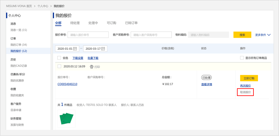 在报价详情页面,【已处理】的商品,点击【如何取消報(bào)價(jià)單】,页面跳转到报价历史页面再次点击【如何取消報(bào)價(jià)單】该报价则被删除。