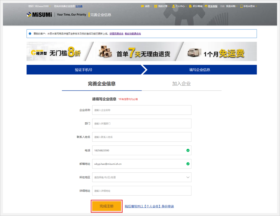 方式一:注冊(cè)成為米思米個(gè)人會(huì)員后,可直接在完成注冊(cè)的頁(yè)面填寫相關(guān)信息,并點(diǎn)擊【完成注冊(cè)】。