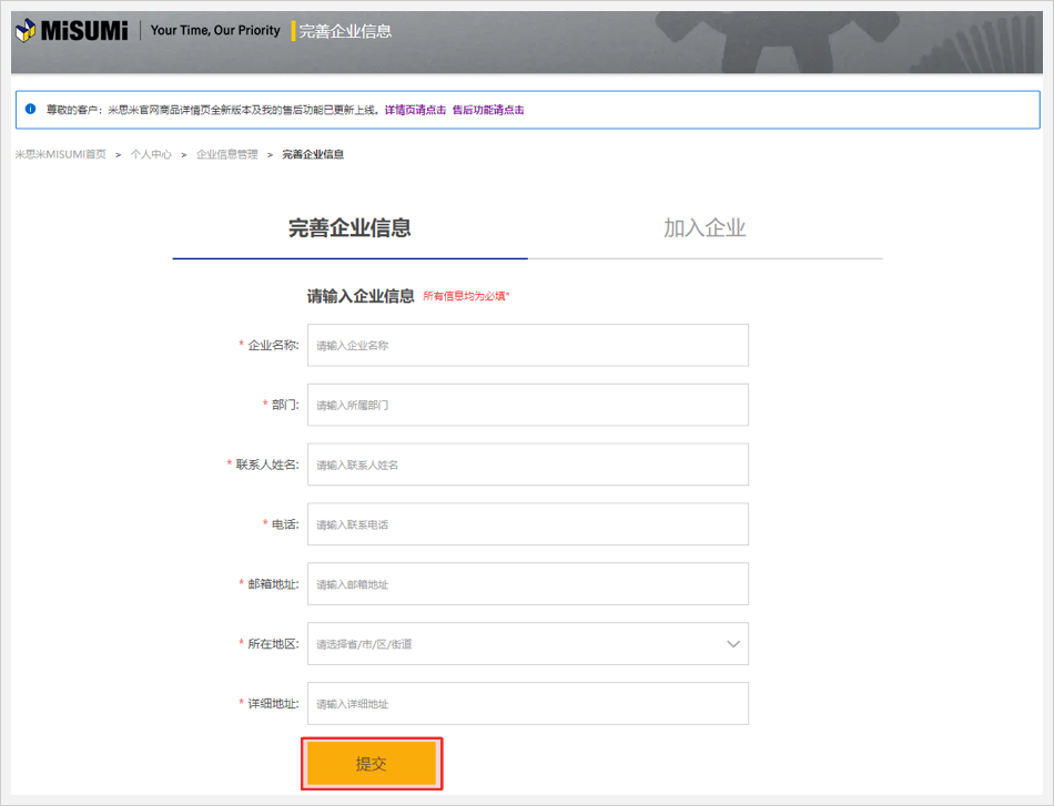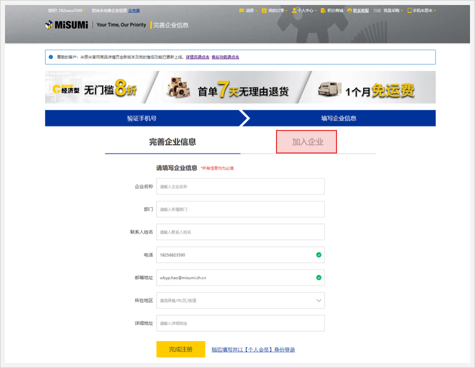 1、完善企業(yè)信息:注冊(cè)成為米思米個(gè)人會(huì)員后,直接在完成注冊(cè)的頁(yè)面點(diǎn)擊【加入企業(yè)】?;蛘咴谑醉?yè)選擇【加入企業(yè)】。
