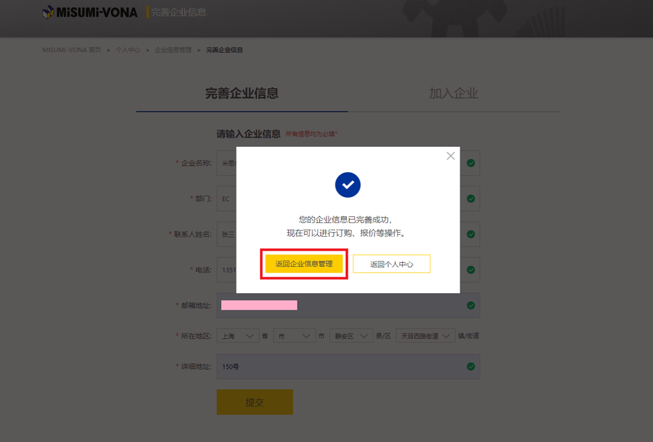 2.企業(yè)信息完善成功,您已成為企業(yè)用戶,您可點(diǎn)擊【返回企業(yè)信息管理】查看企業(yè)詳情。