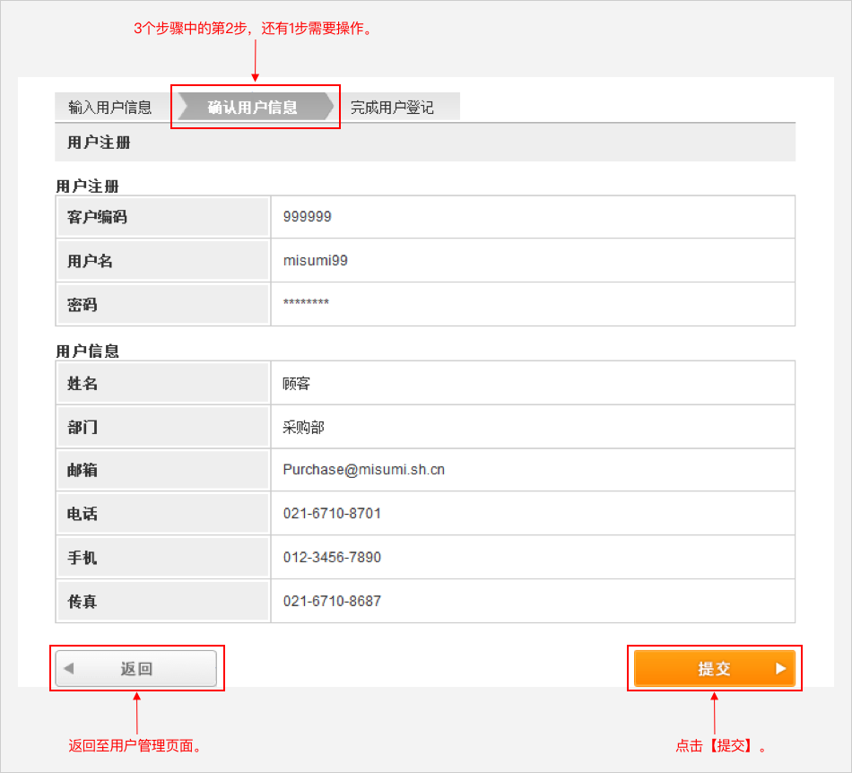 请确认页面上的内容。如还需修正请点击【返回】。