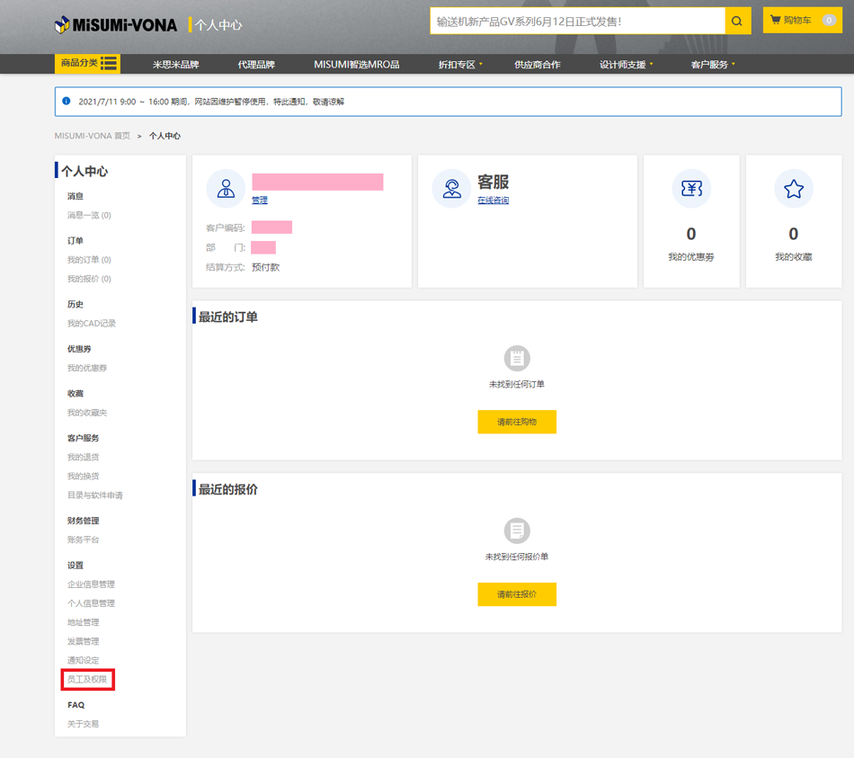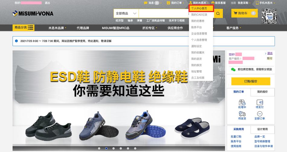1.點(diǎn)擊米思米官網(wǎng)首頁(yè)【我的米思米】-【個(gè)人中心首頁(yè)】。