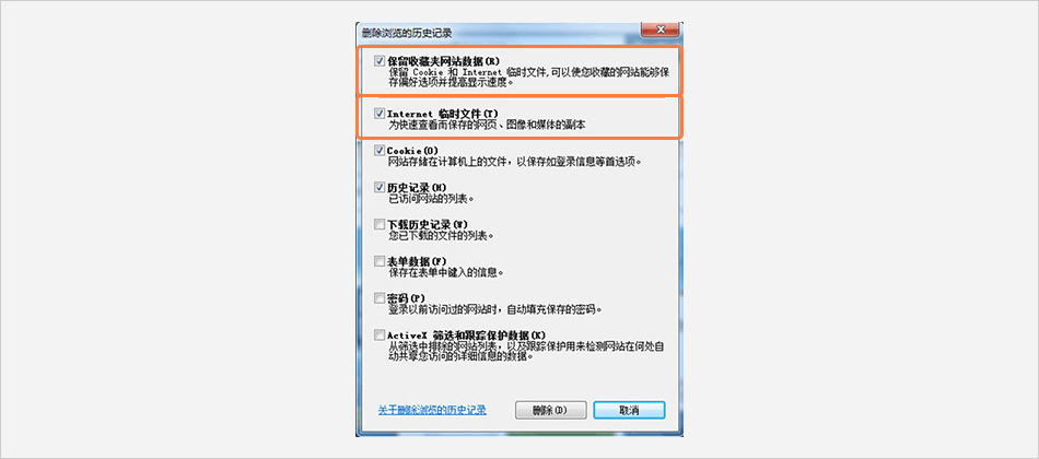 (2) 勾選 [保留收藏夾網(wǎng)站數(shù)據(jù)]、[Internet臨時文件] 后 → [刪除]