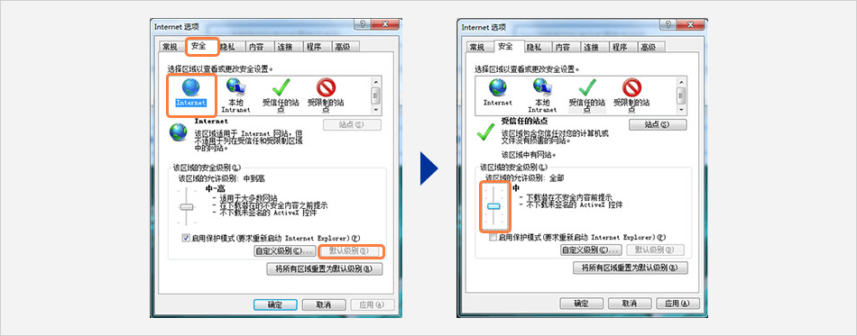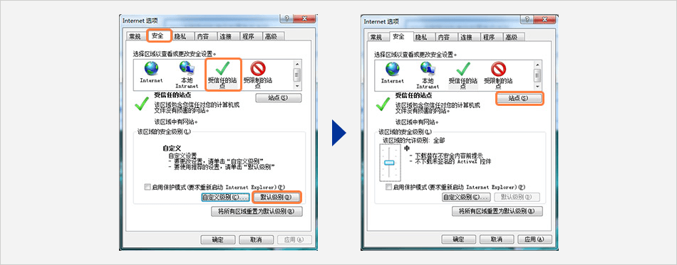 (1) 點擊 [安全] → [受信任的站點] → [默認(rèn)級別] → [中] → [站點]