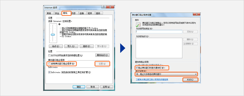 (2) 勾選 [阻止彈出窗口時顯示通知欄] → 選擇阻止級別 [中] → [關(guān)閉]