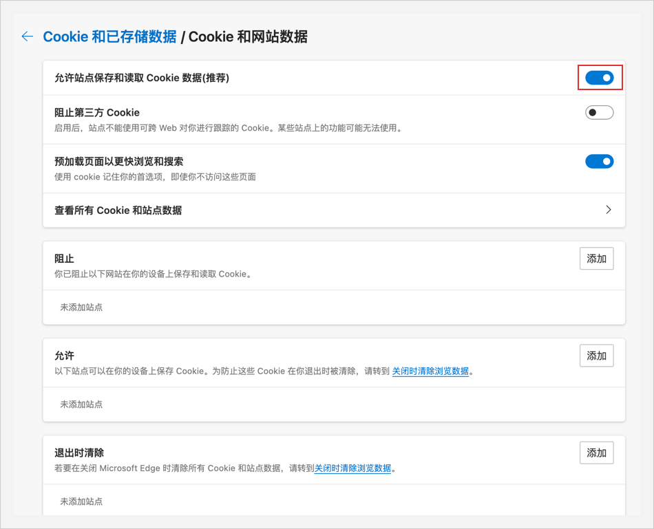 設置——cookie和網站權限——cookie和已存儲數據——管理和刪除cookie和站點數據——打開【允許站點保存和讀取cookie數據】