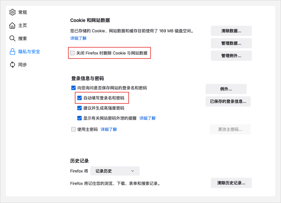 ①設置——隱私與安全——cookie和網站數據——取消勾選【關閉firefox時刪除cookie與網站數據】