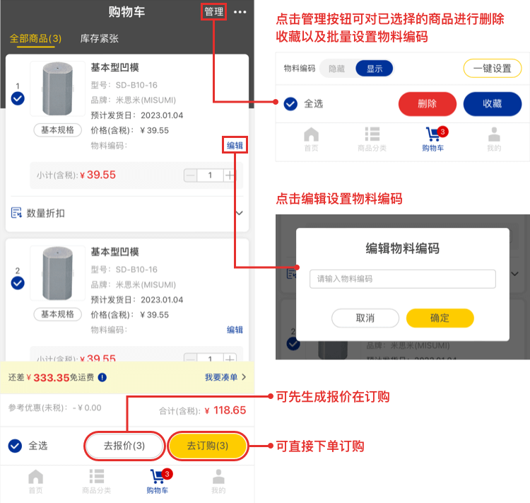 在购物车中,可以对选中的商品进行报价和订购