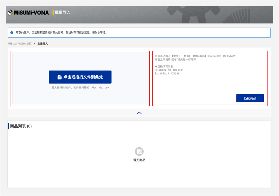 可根據(jù)操作習(xí)慣使用點(diǎn)擊或拖拽方式把文件導(dǎo)入,也可直接復(fù)制采購清單內(nèi)容或手動(dòng)輸入型號、數(shù)量、物料編碼進(jìn)行導(dǎo)入。