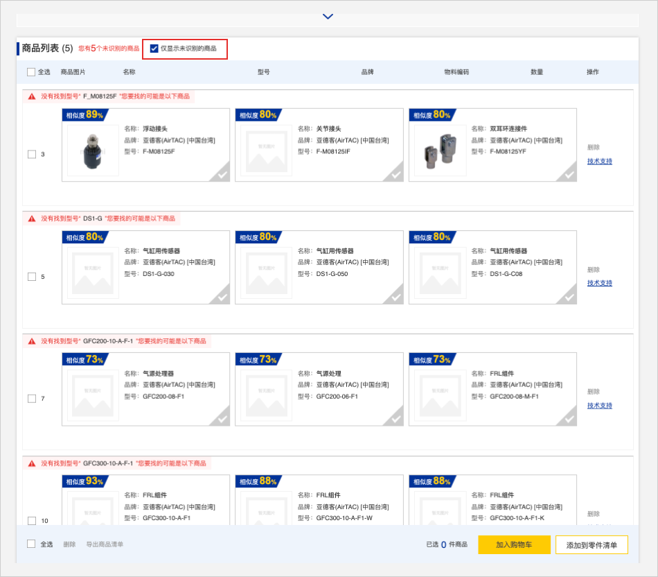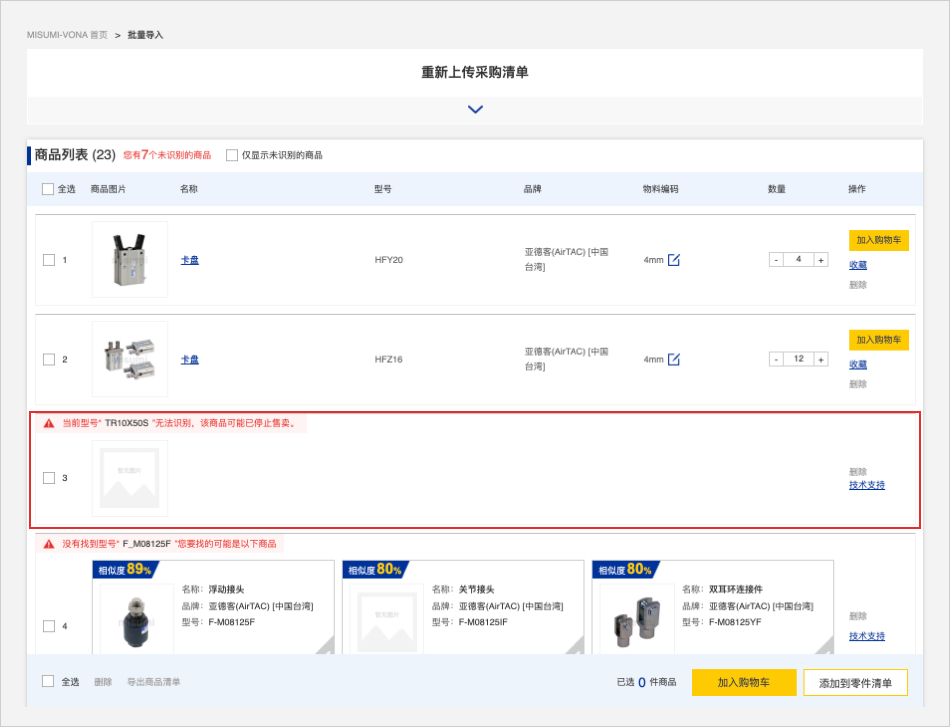 對于正常商品選中后可以【加入購物車】【添加到零件清單】【導(dǎo)出商品清單】【刪除】【收藏】以及物料編碼和數(shù)量的編輯
