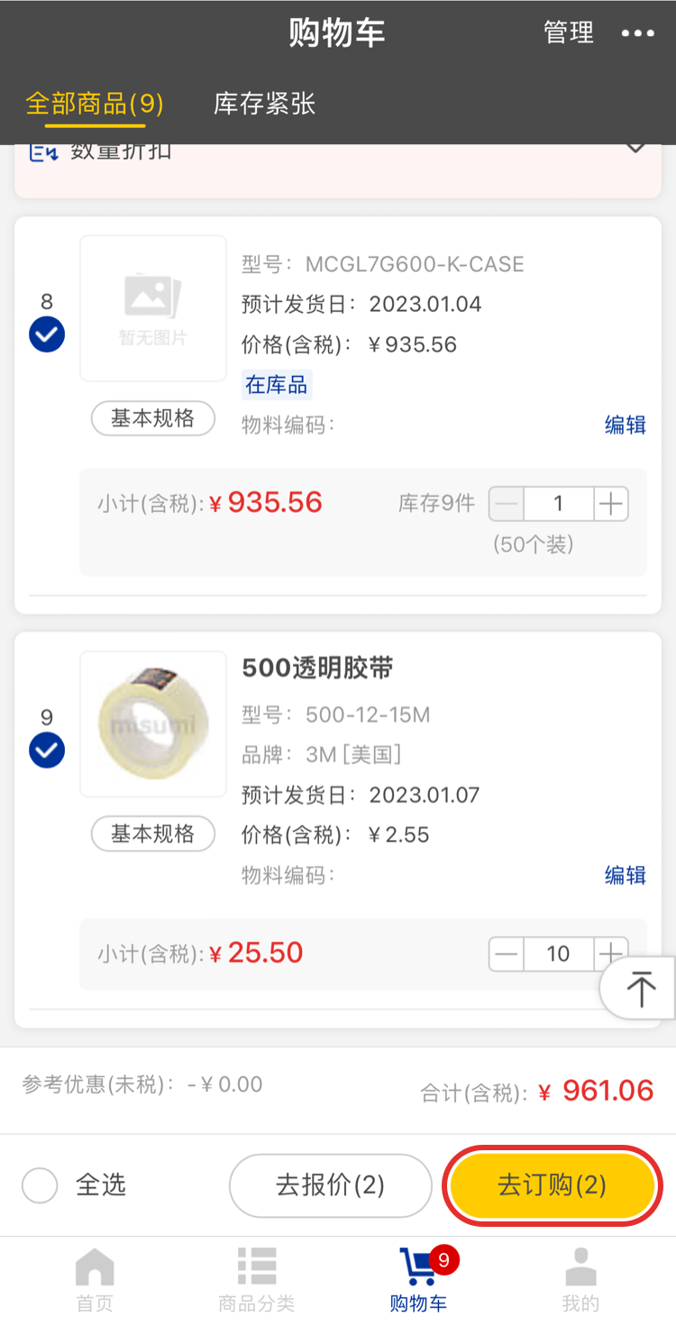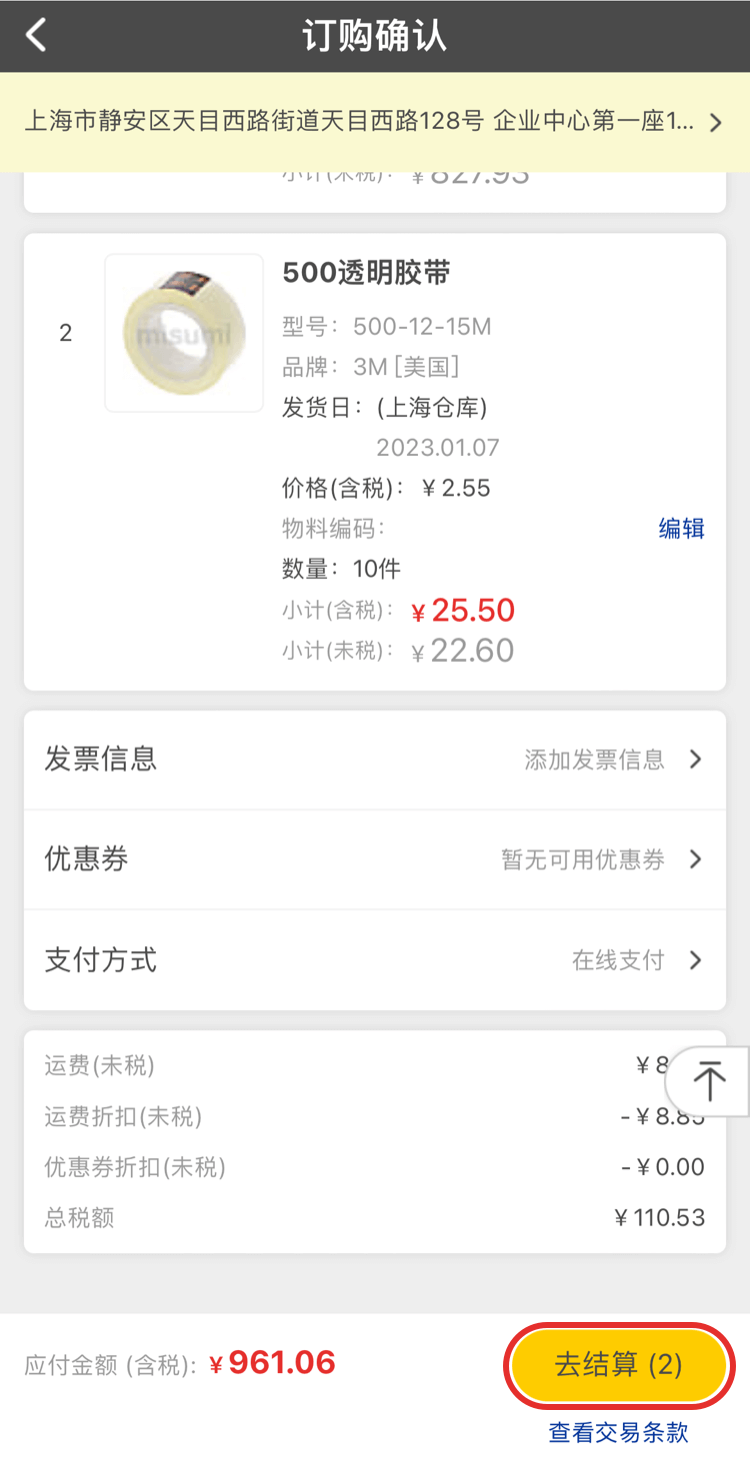 確認需要訂購的商品、數量、價格和交期沒有問題后,點擊【去結算】可完成訂單的下訂。