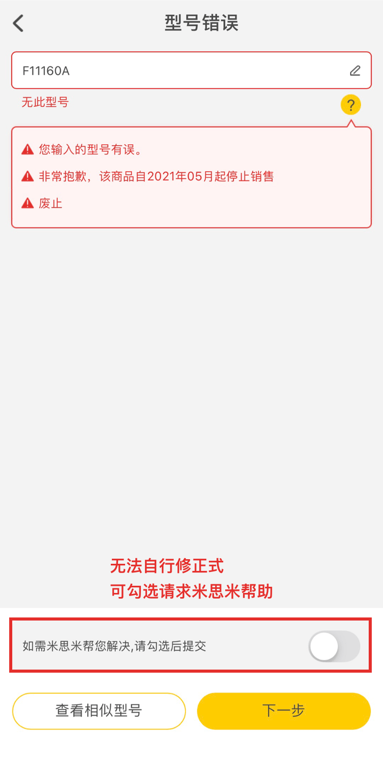 訂單中有需要確認的商品時,請按照相應的提示信息進行逐個操作。修正完畢,點擊【去結算】,將更新訂單信息。如未能正確修正時,將再次顯示本頁面。如需米思米幫助解決,