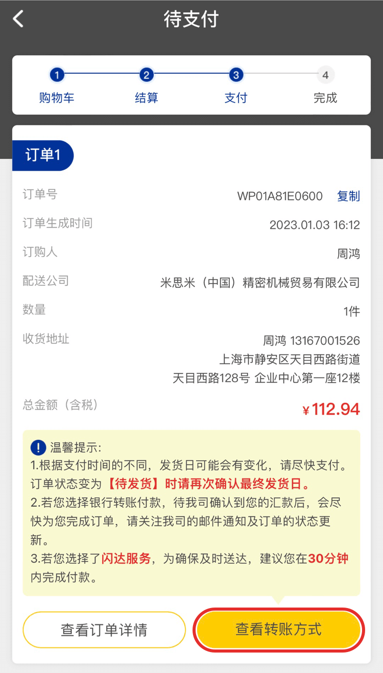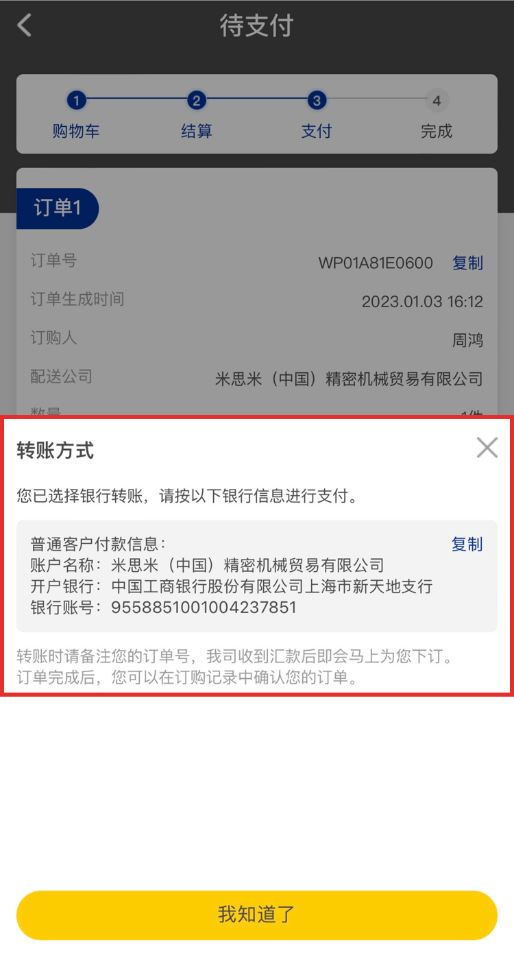 如果您的支付方式為銀行轉賬,在訂購確認頁面選擇銀行轉賬,點擊去結算,在待支付頁面點擊【查看轉賬方式】根據提示轉賬至米思米。