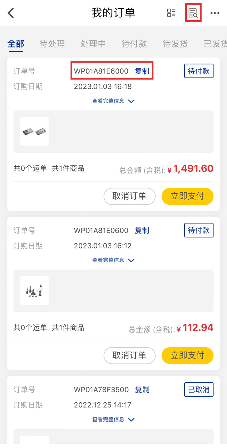 一、在“我的”頁面,可根據不同的訂單狀態(tài)檢索訂單記錄。