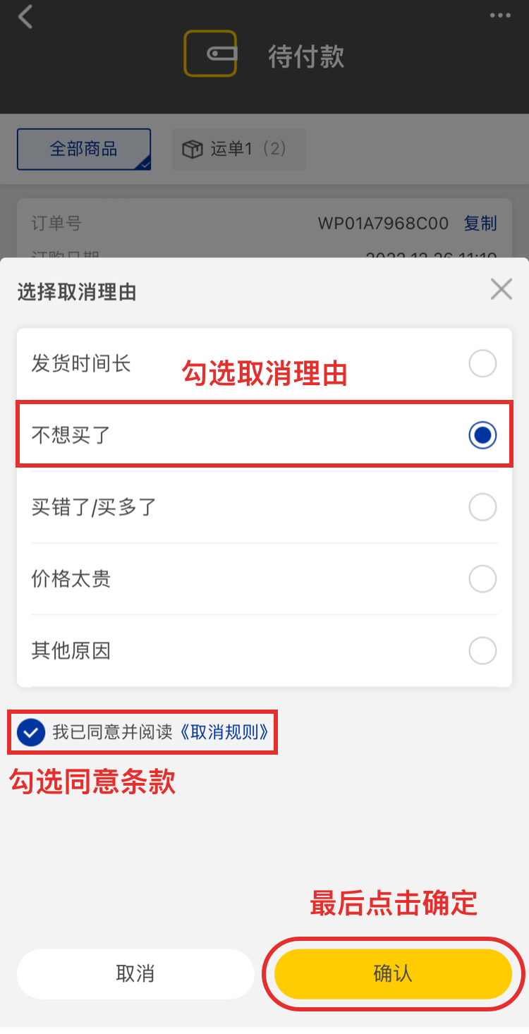 6、點(diǎn)擊取消訂單/取消后彈出【選擇取消理由】彈層,勾選完取消理由,閱讀并勾選同意《取消規(guī)則》,最后點(diǎn)擊【確定】按鈕取消操作就完成了。