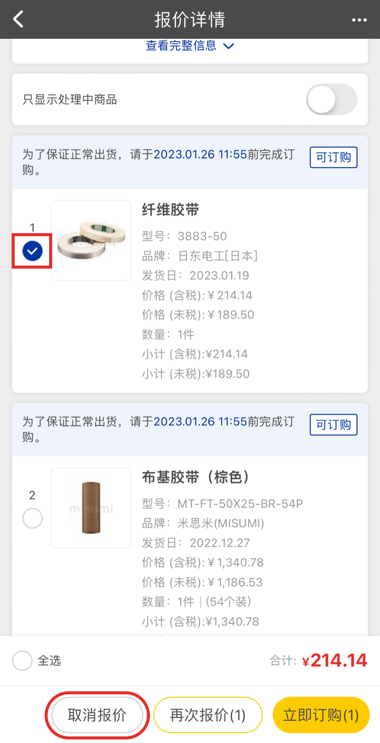 4、在【報(bào)價(jià)詳情】頁面找到相應(yīng)需要取消報(bào)價(jià)的商品勾選后,點(diǎn)擊左側(cè)【取消報(bào)價(jià)】,取消報(bào)價(jià)操作就完成了。