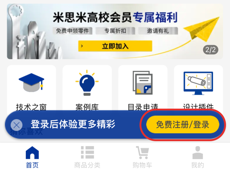 1.點(diǎn)擊米思米首頁【免費(fèi)注冊/登錄】