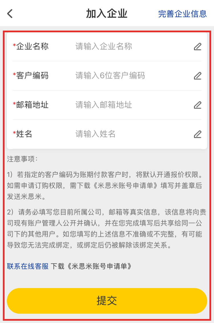 加入現(xiàn)有企業(yè):您的企業(yè)已在米思米注冊成為企業(yè)用戶(即已有客戶編碼),請選擇該方式。