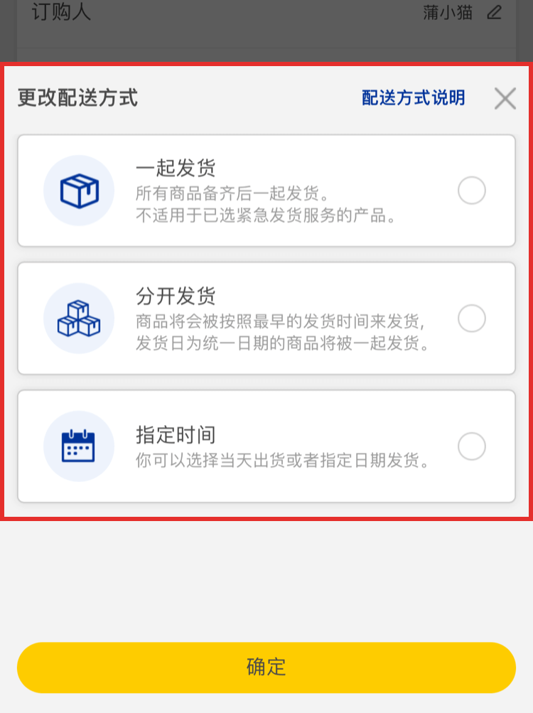請(qǐng)從"一起發(fā)貨、分開(kāi)發(fā)貨、指定發(fā)貨日"中選擇一種您希望的方式。