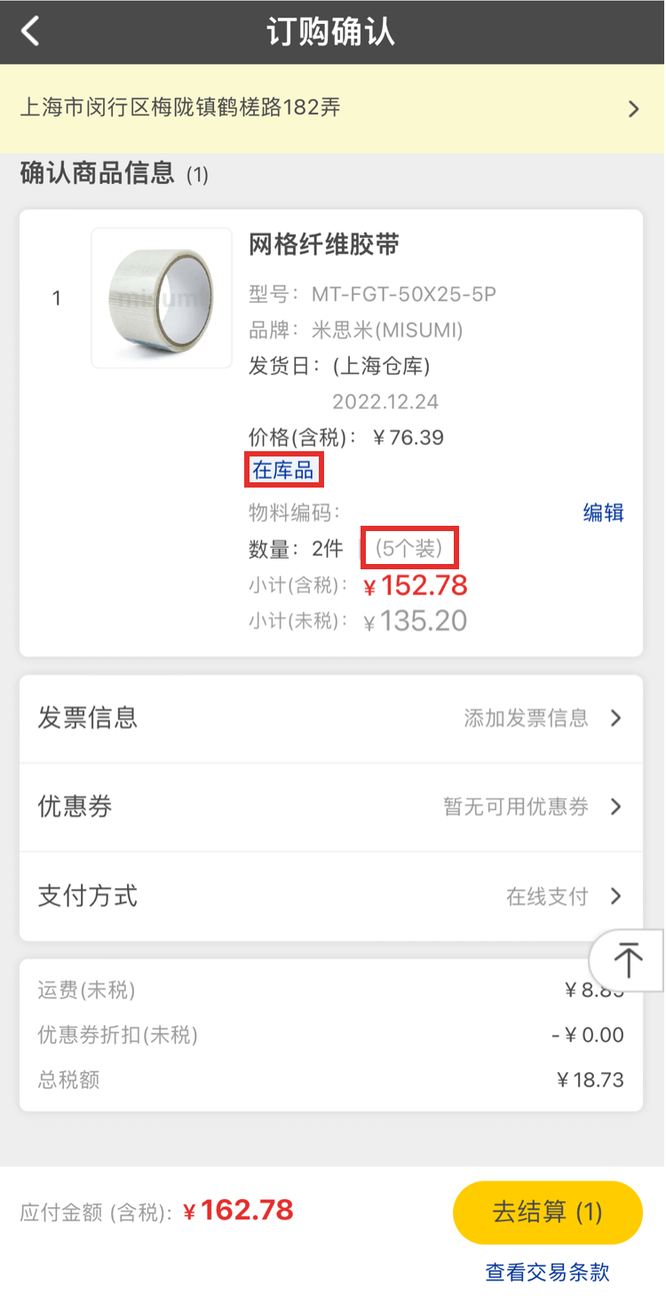 填入相應(yīng)內(nèi)容,點(diǎn)擊【去結(jié)算】去到結(jié)算頁(yè)面。