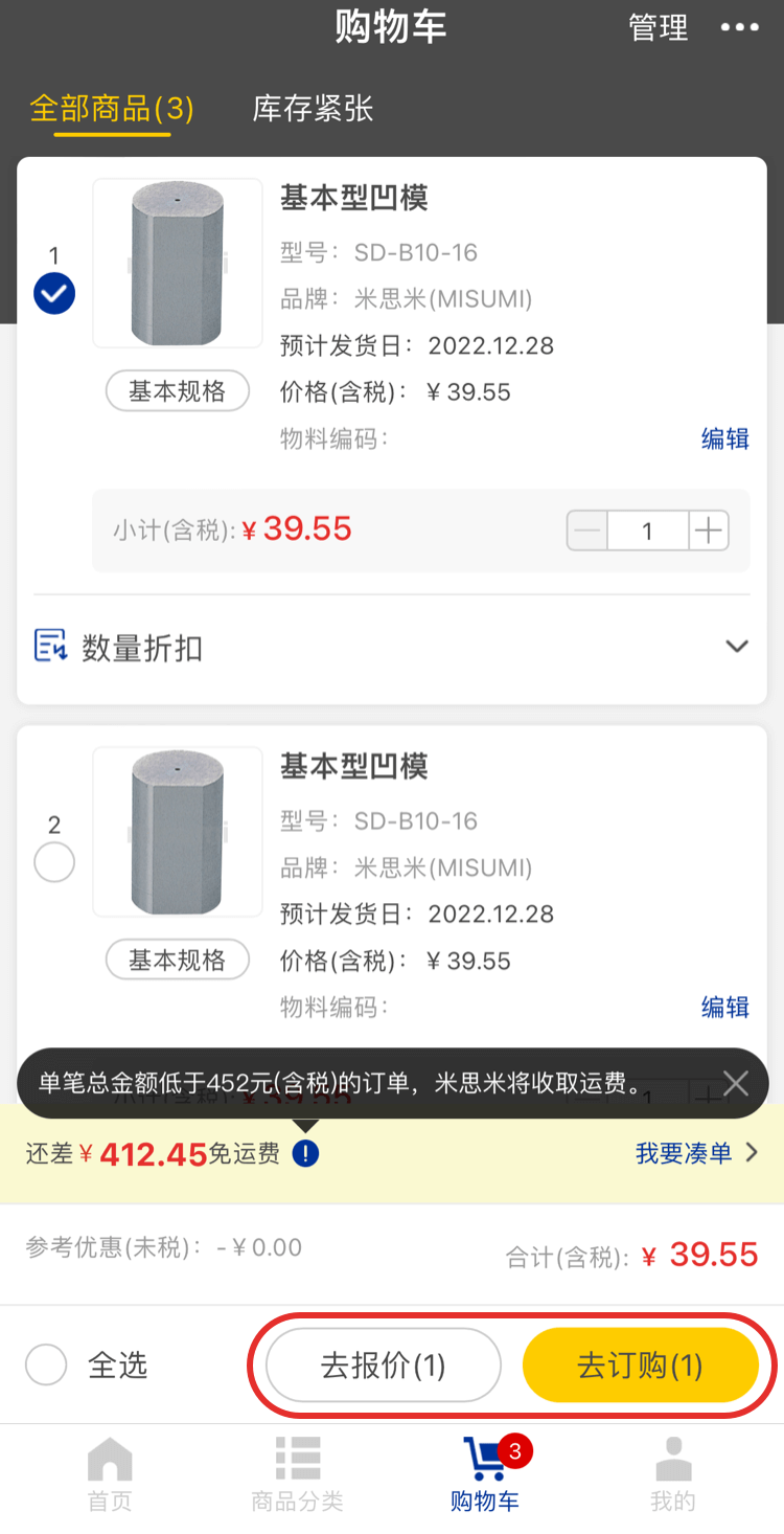 進入購物車頁面后,勾選該商品選擇【直接訂購】或者【生成報價單】跳轉(zhuǎn)至對應的確認訂單信息頁面