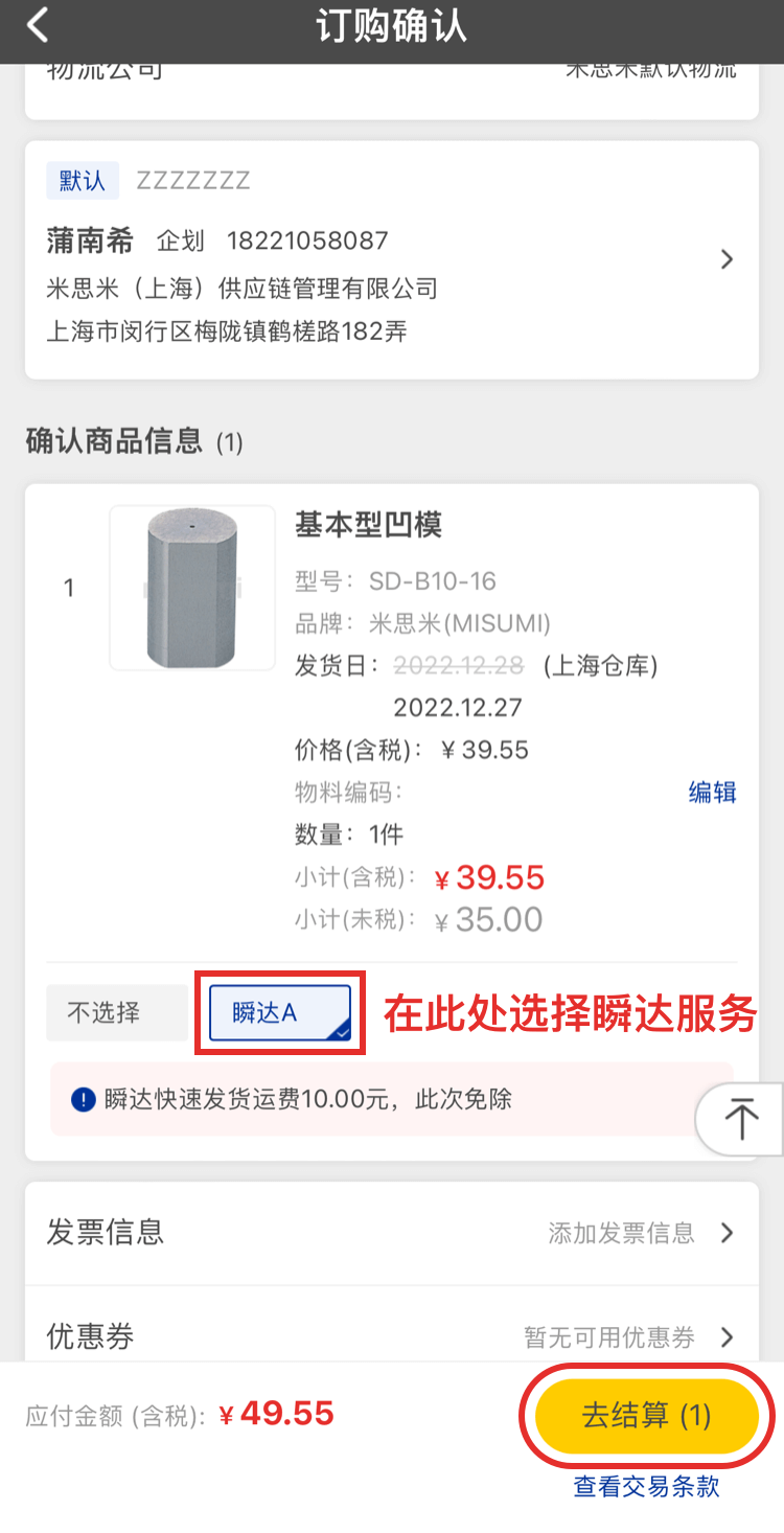 在確認訂單信息頁面中的確認商品信息一列中勾選瞬達選項,之后您可點擊【去結(jié)算】完成訂購;或點擊【完成報價】生成報價單。