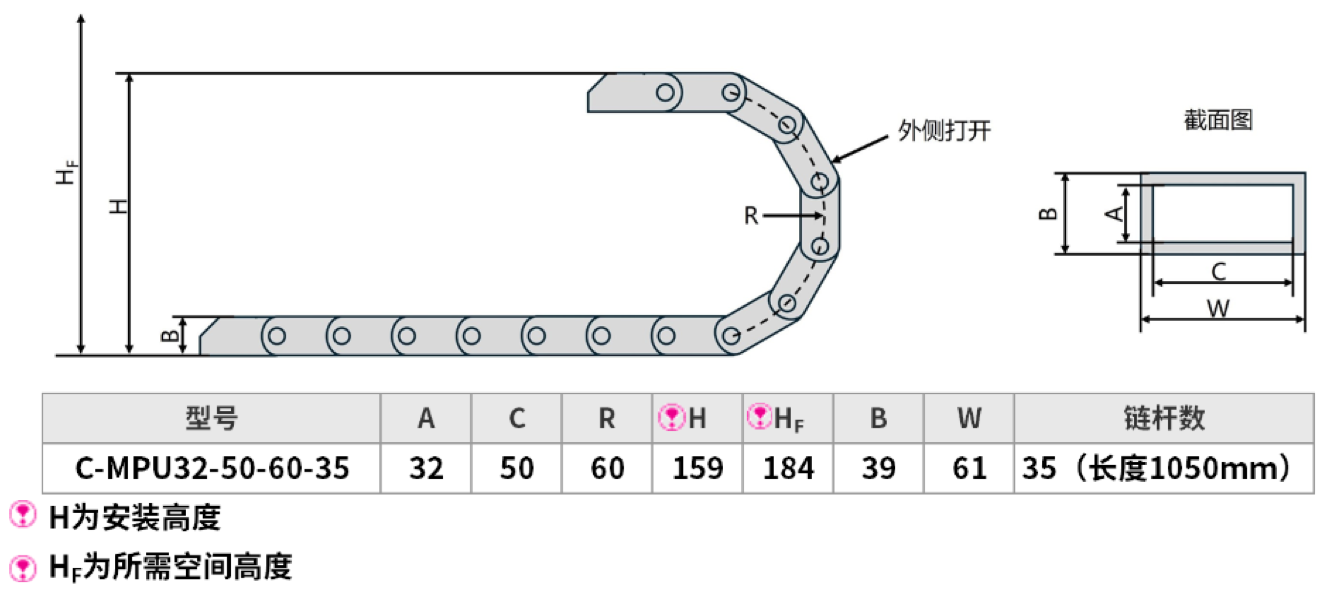 2、考慮安裝空間:安裝拖鏈的空間大小也會限制其長度。需要測量安裝位置的可用長度和高度,確保所選拖鏈能夠在有限的空間內正常安裝和運行,不會與其他部件發(fā)生干涉。